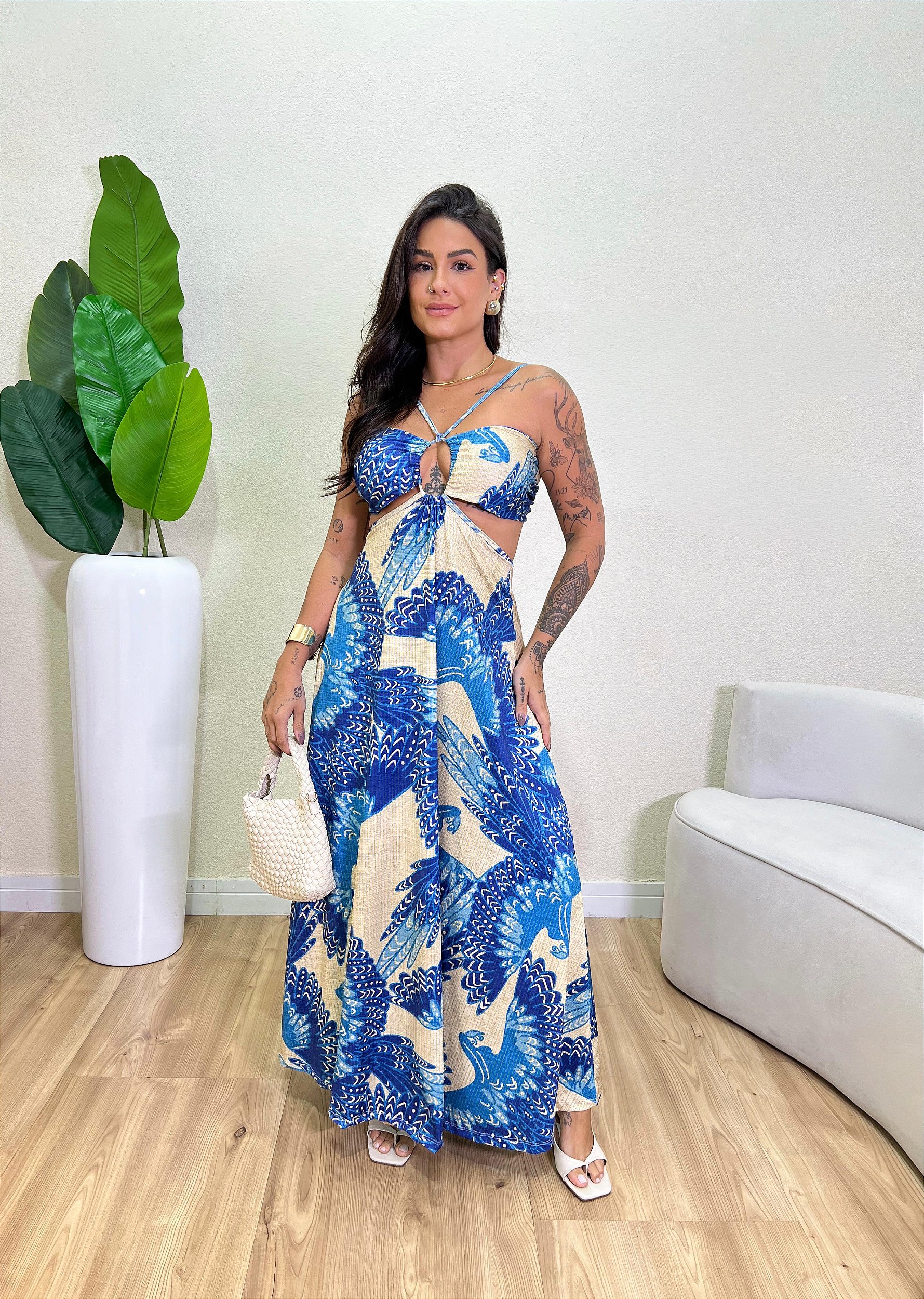 Vestido longo estampado estilo farm, tamanho único, veste do 34 ao 46, em malha fria, amarração nas costas, possui bojo.